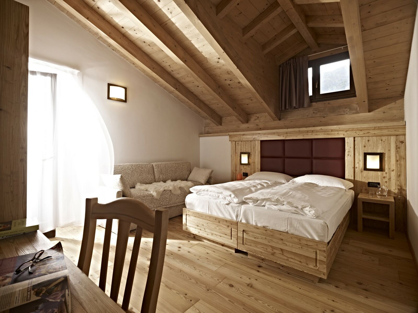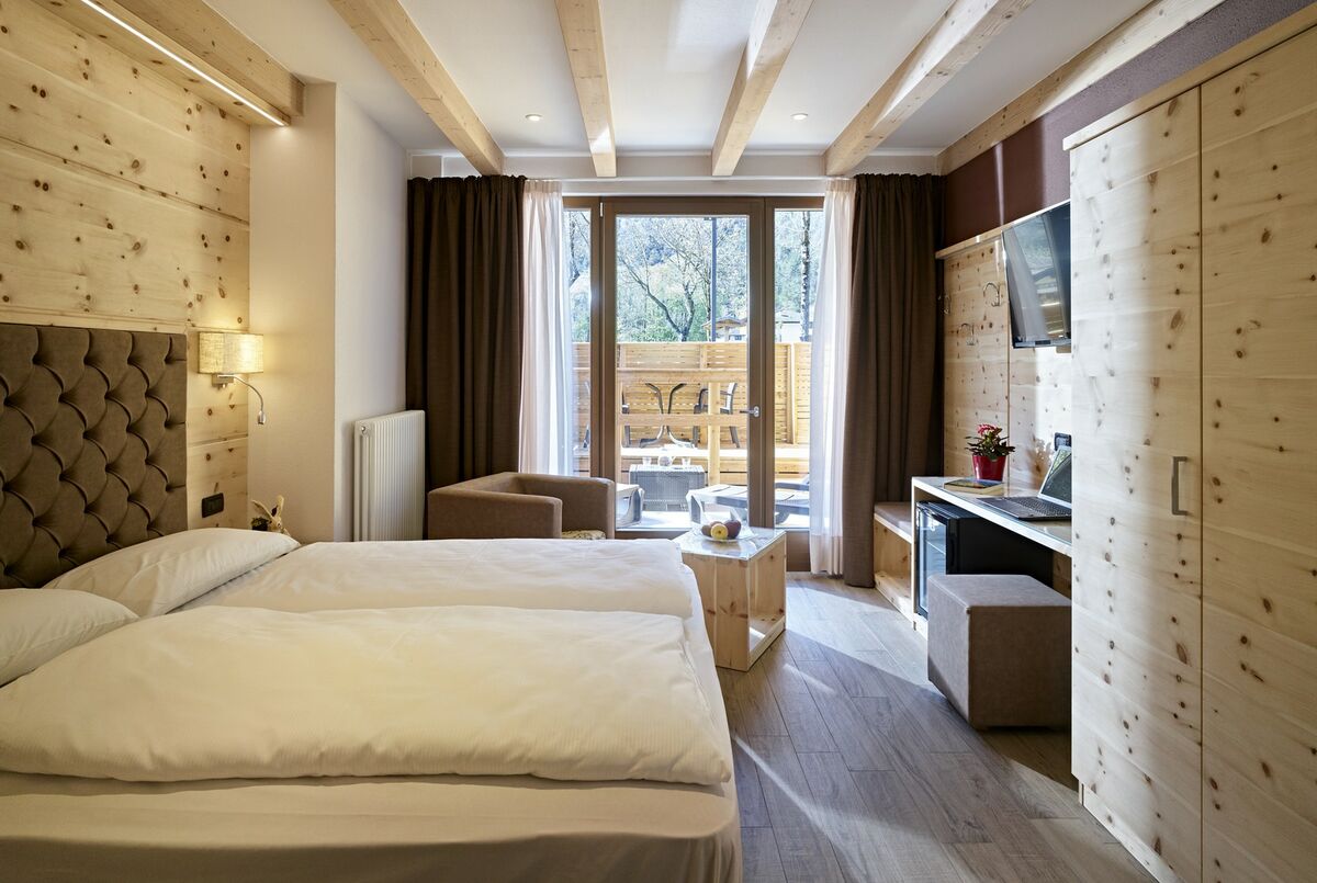Semplicemente inconfondibile: la camera Superior, in mansarda, si distingue per l’arredo in larice spazzolato e per il parquet. Un vero e proprio rifugio in cui è un vero piacere tornare la sera, dopo aver scoperto nuovi angoli del Trentino. Per coppie e per famiglie, questa sistemazione ti stupisce nell’istante in cui si apre la porta del balcone: ad attenderti c’è infatti una magnifica vista rivolta verso il lago di Ledro, che riflettono il panorama delle montagne circostanti. Per un soggiorno di livello superiore.